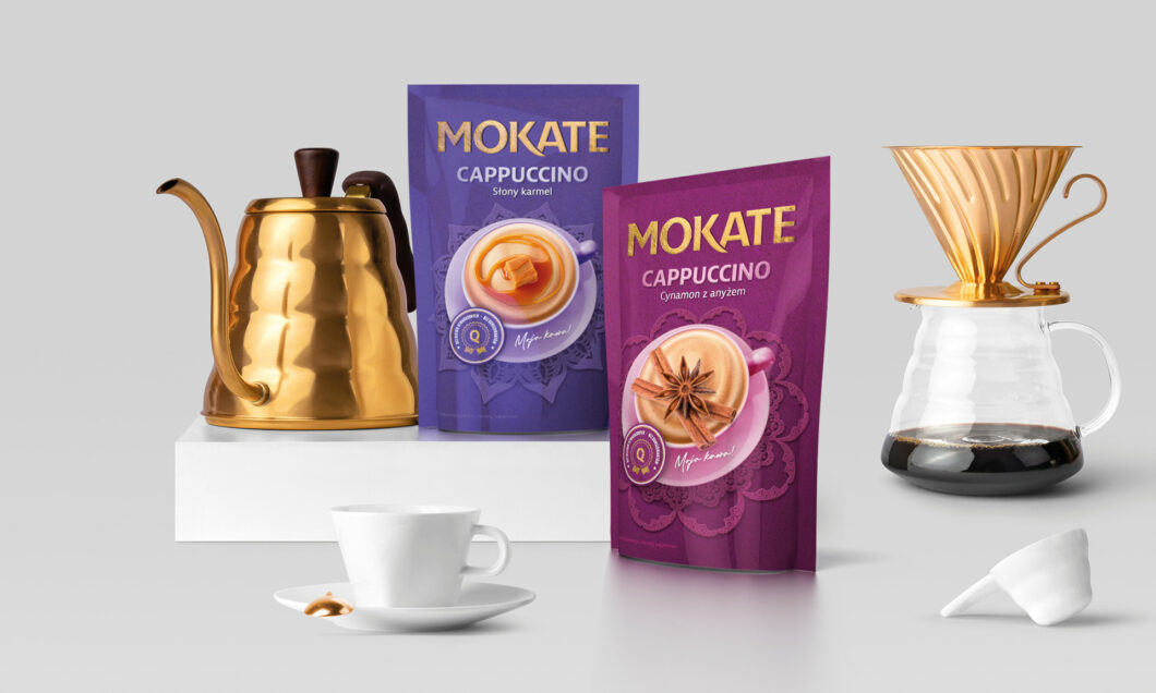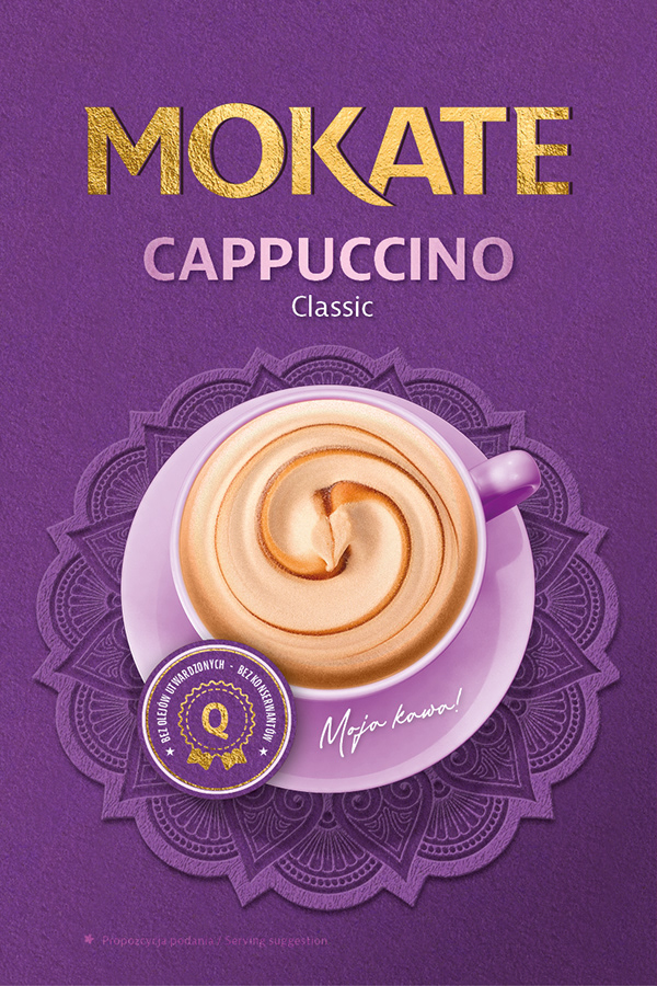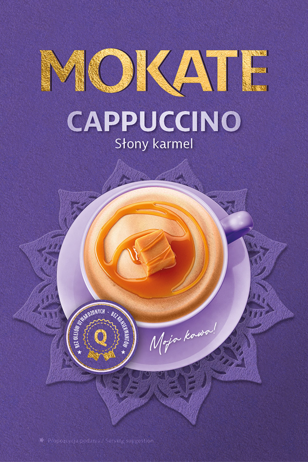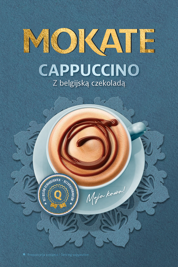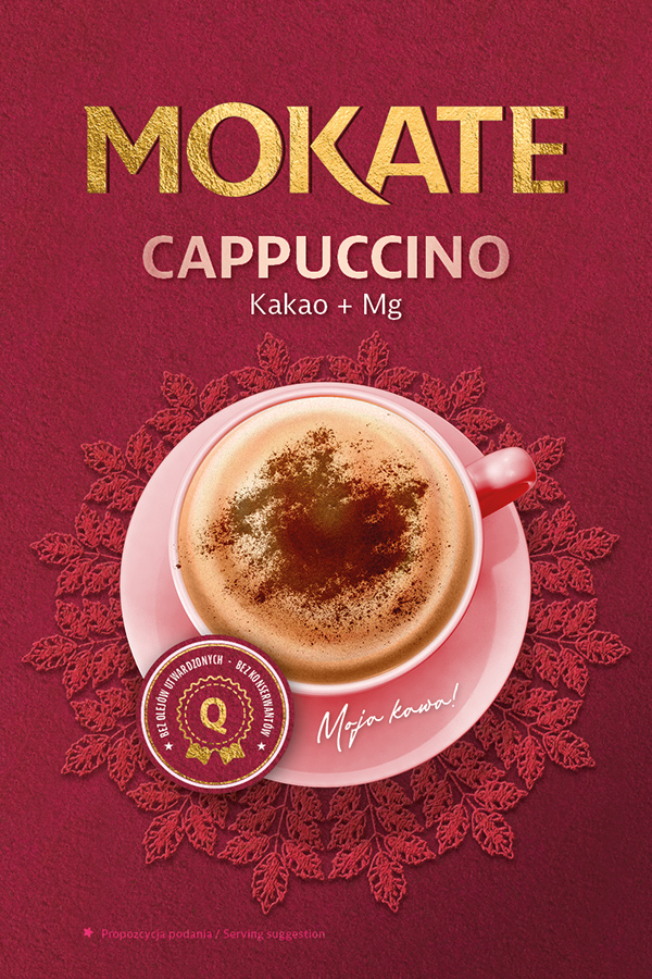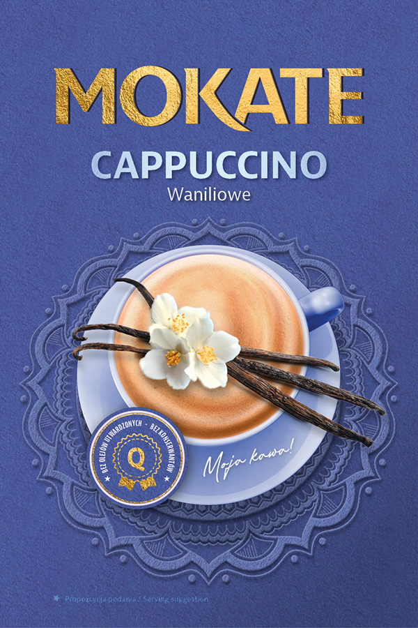Seria Mokate Cappuccino w „dessert look”: głębokie, jednolite tła pod każdy smak, złoty efekt logotypu, filiżanka na koronkowej rozecie. Kremowa pianka z charakterystycznym swirl oraz realne składniki (wanilia, cynamon, karmel, belgijska czekolada) podbijają apetyt. Czytelna kolejność odczytu — MOKATE → CAPPUCCINO → wariant — gwarantuje szybki wybór na półce i w e-commerce.