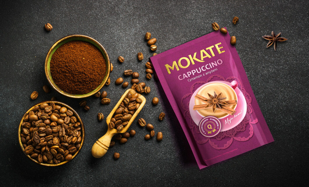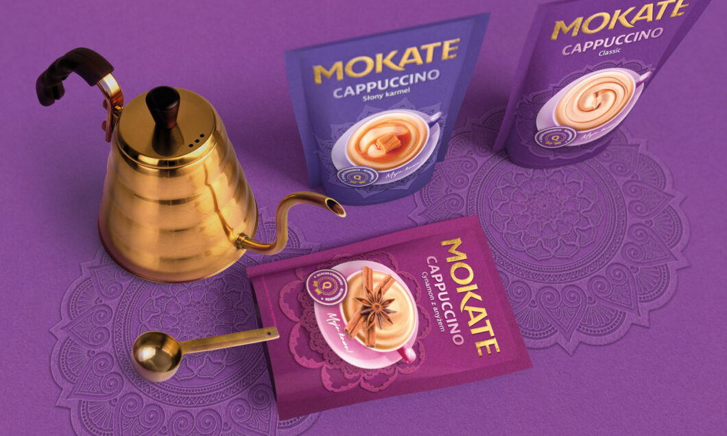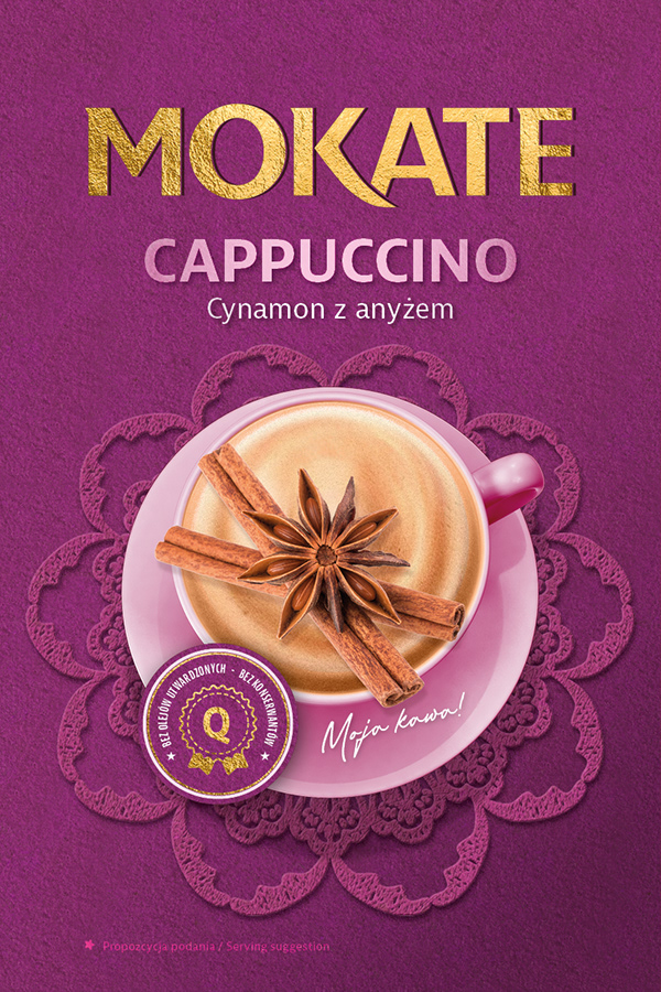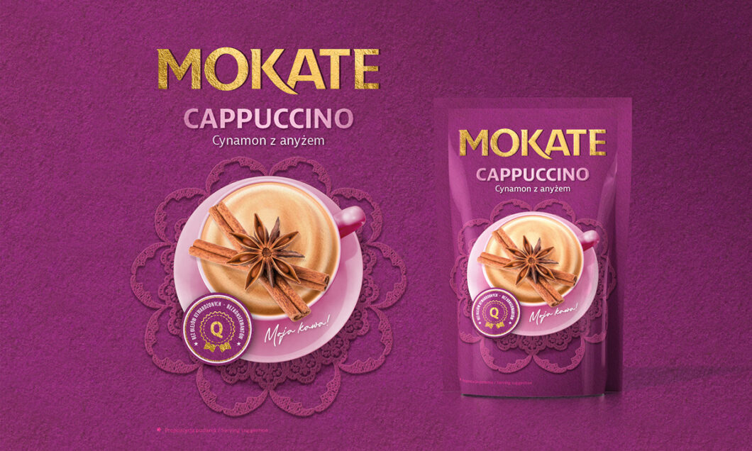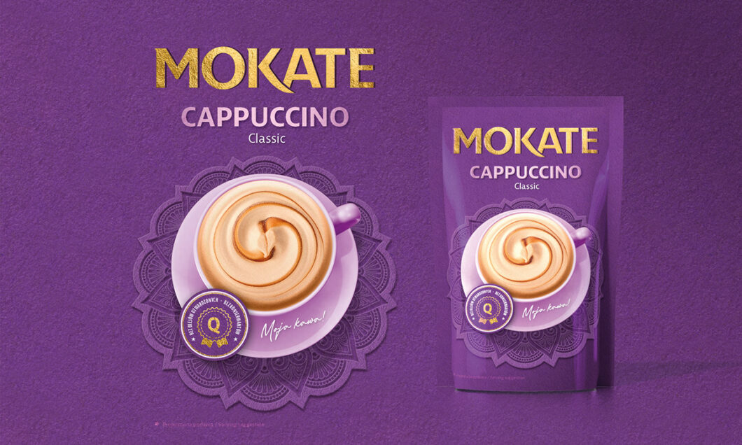 Seria Mokate Cappuccino w „dessert look”: głębokie, jednolite tła pod każdy smak, złoty efekt logotypu, filiżanka na koronkowej rozecie. Kremowa pianka z charakterystycznym swirl oraz realne składniki (wanilia, cynamon, karmel, belgijska czekolada) podbijają apetyt. Czytelna kolejność odczytu — MOKATE → CAPPUCCINO → wariant — gwarantuje szybki wybór na półce i w e-commerce.