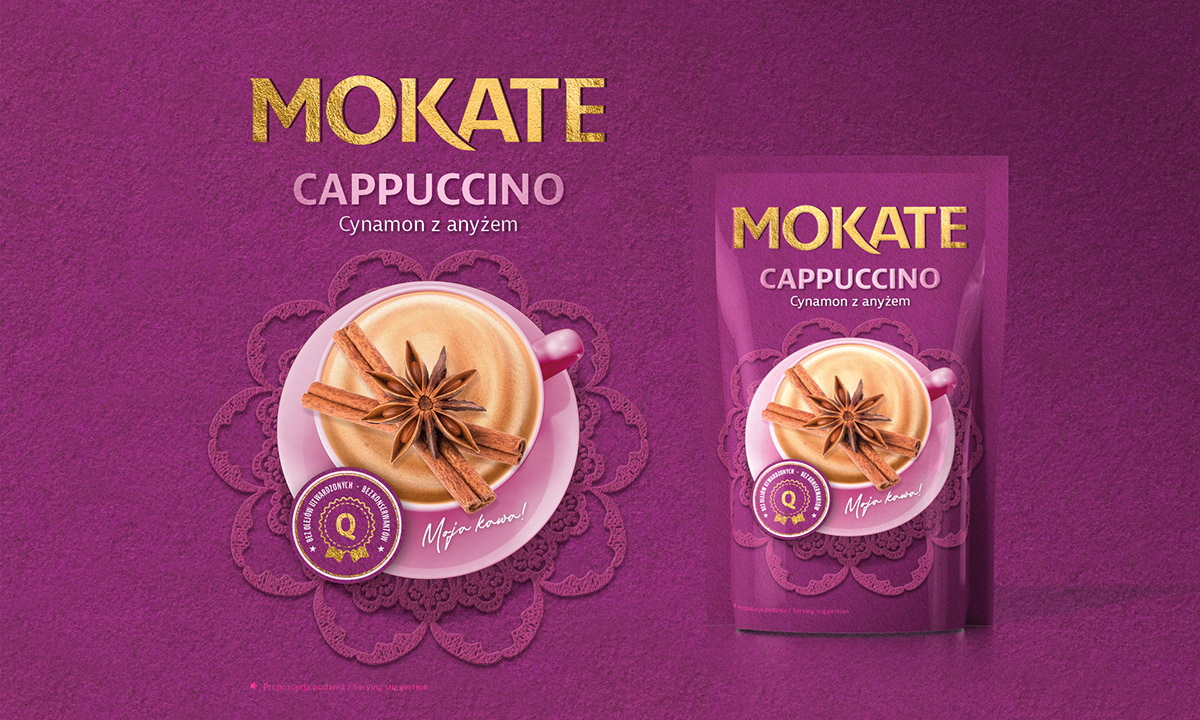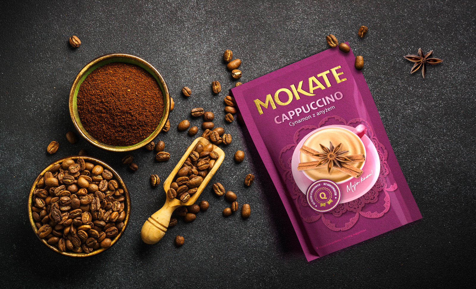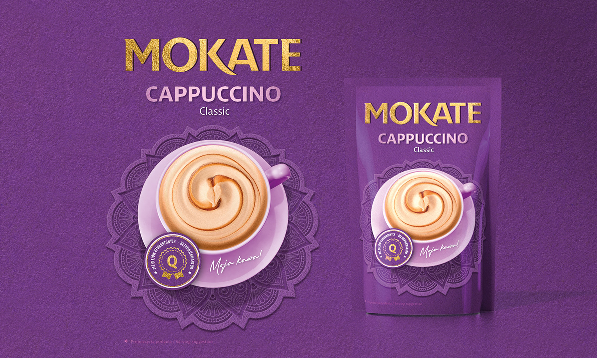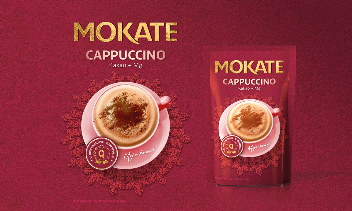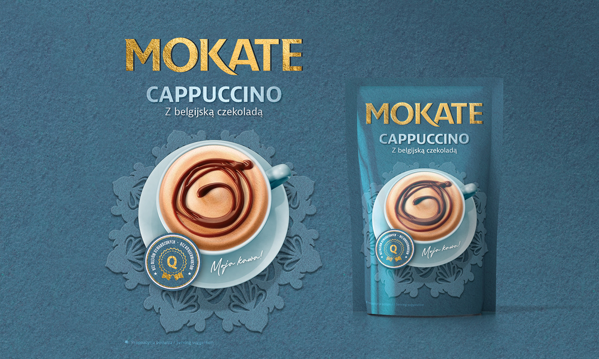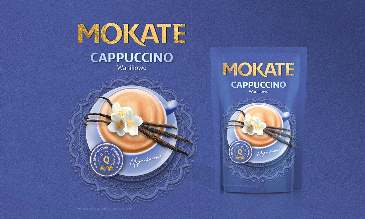 Seria Mokate Cappuccino w „dessert look”: głębokie, jednolite tła pod każdy smak, złoty efekt logotypu, filiżanka na koronkowej rozecie. Kremowa pianka z charakterystycznym swirl oraz realne składniki (wanilia, cynamon, karmel, belgijska czekolada) podbijają apetyt. Czytelna kolejność odczytu — MOKATE → CAPPUCCINO → wariant — gwarantuje szybki wybór na półce i w e-commerce.