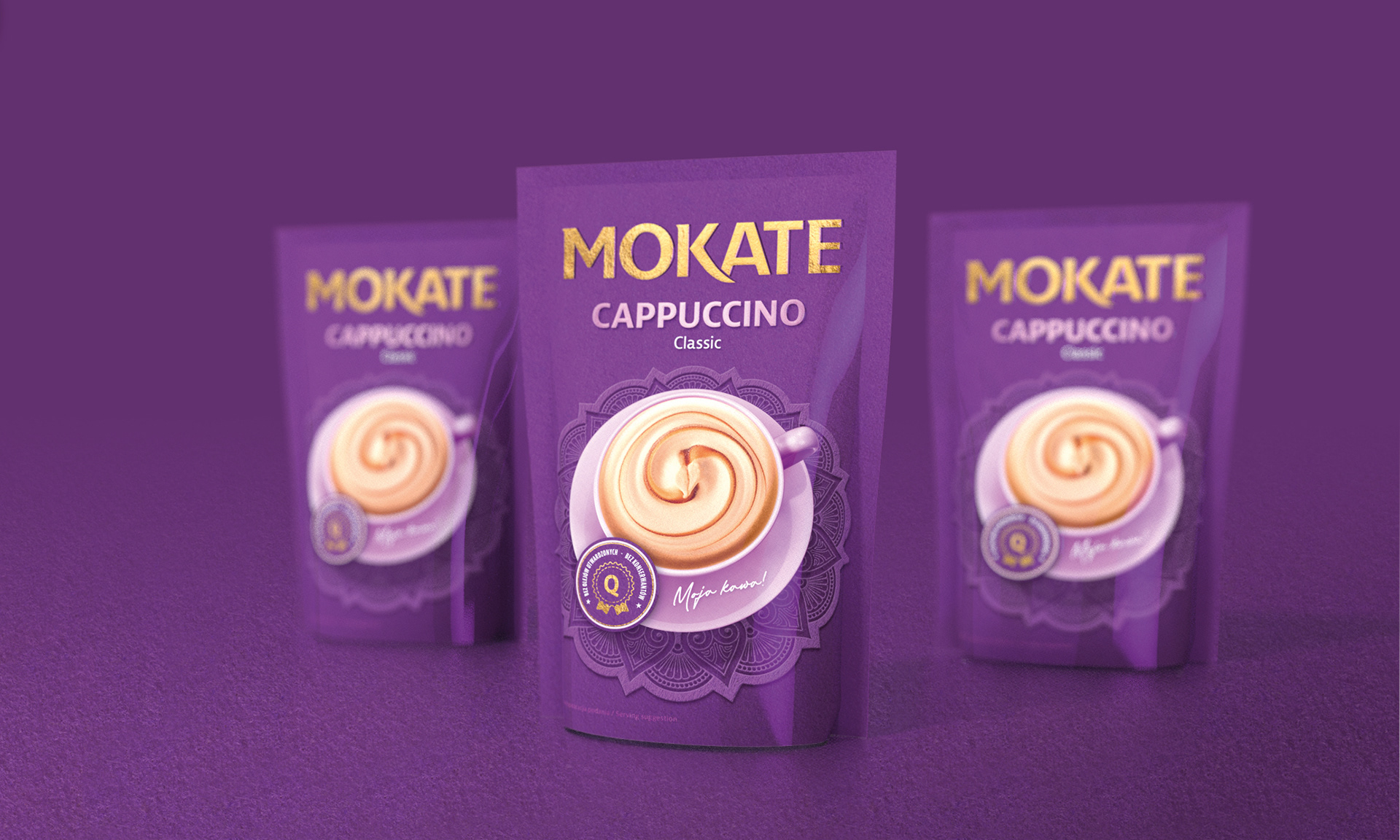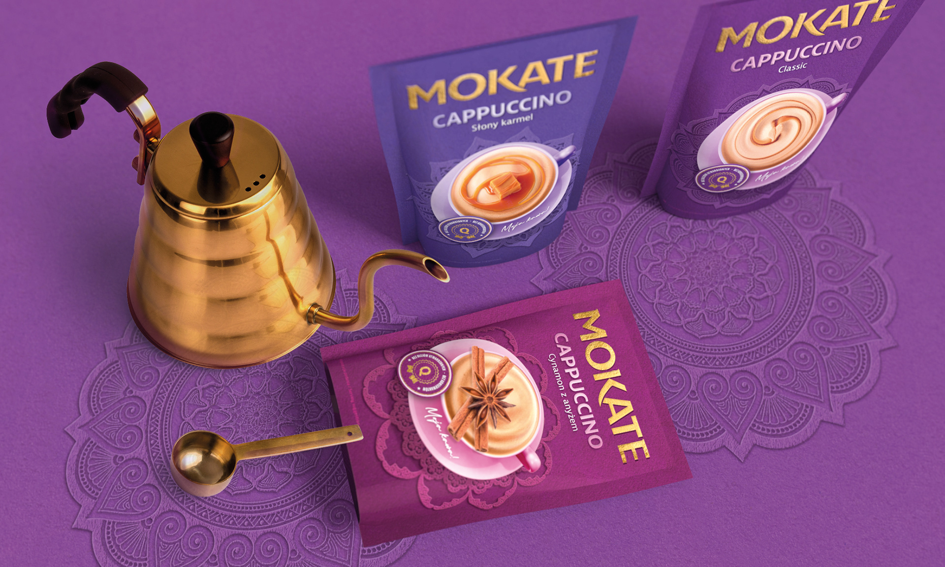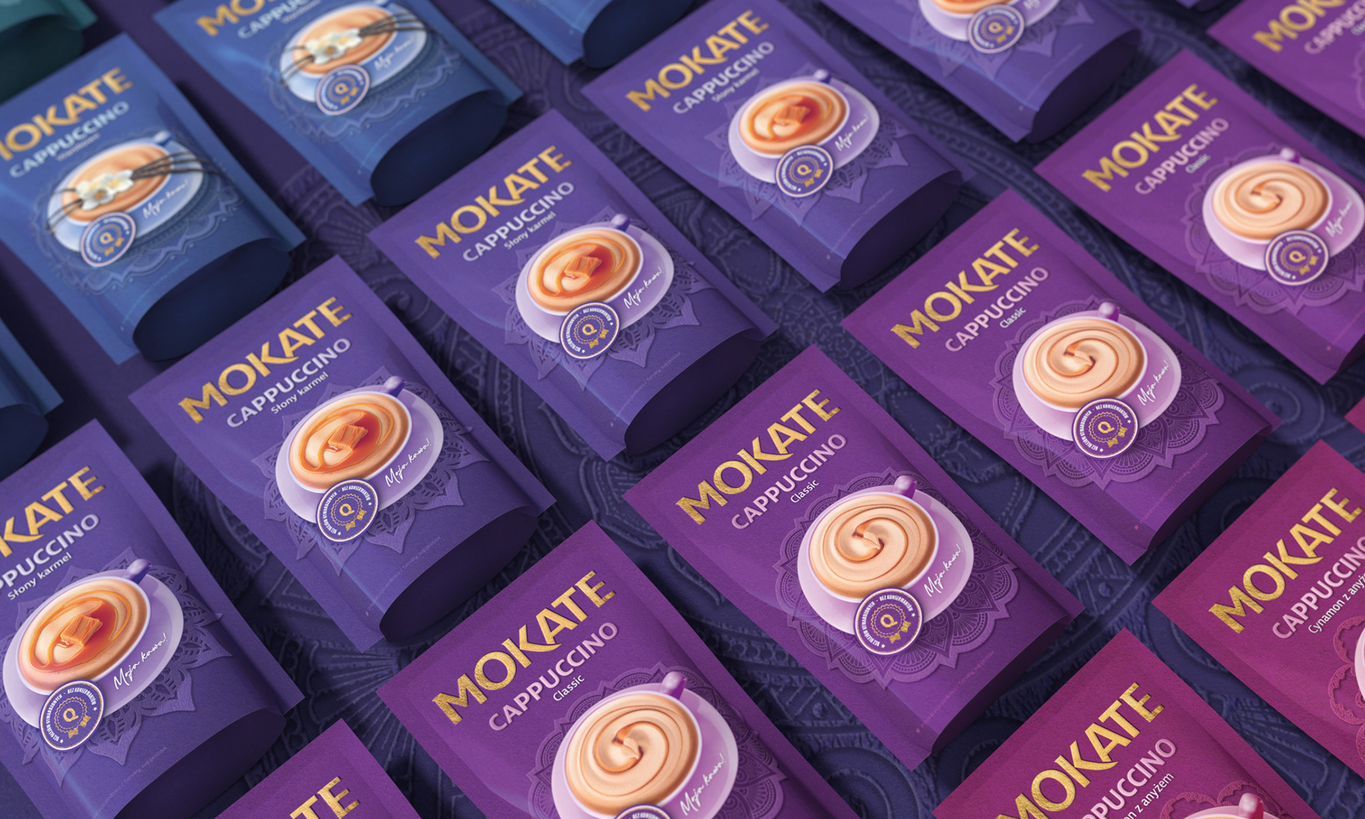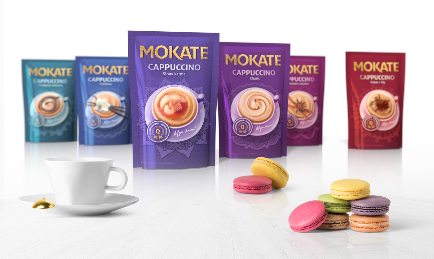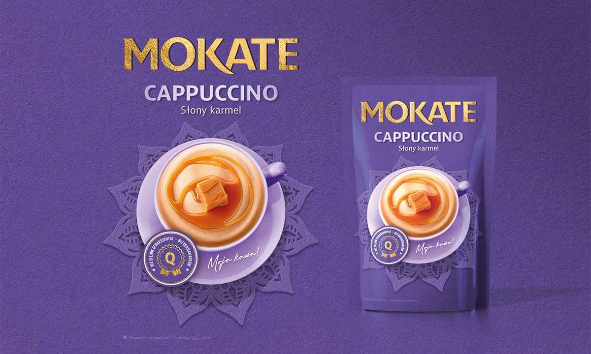 Seria Mokate Cappuccino w „dessert look”: głębokie, jednolite tła pod każdy smak, złoty efekt logotypu, filiżanka na koronkowej rozecie. Kremowa pianka z charakterystycznym swirl oraz realne składniki (wanilia, cynamon, karmel, belgijska czekolada) podbijają apetyt. Czytelna kolejność odczytu — MOKATE → CAPPUCCINO → wariant — gwarantuje szybki wybór na półce i w e-commerce.