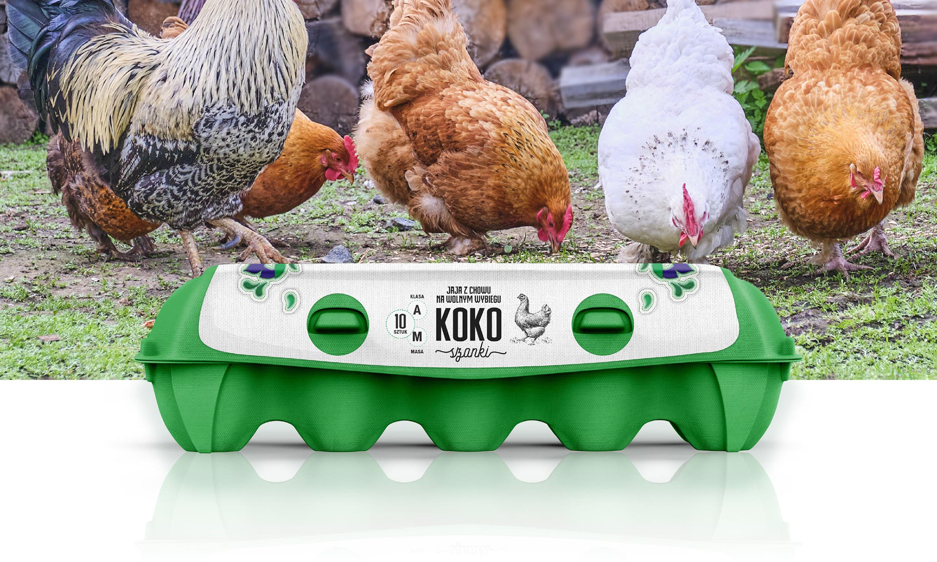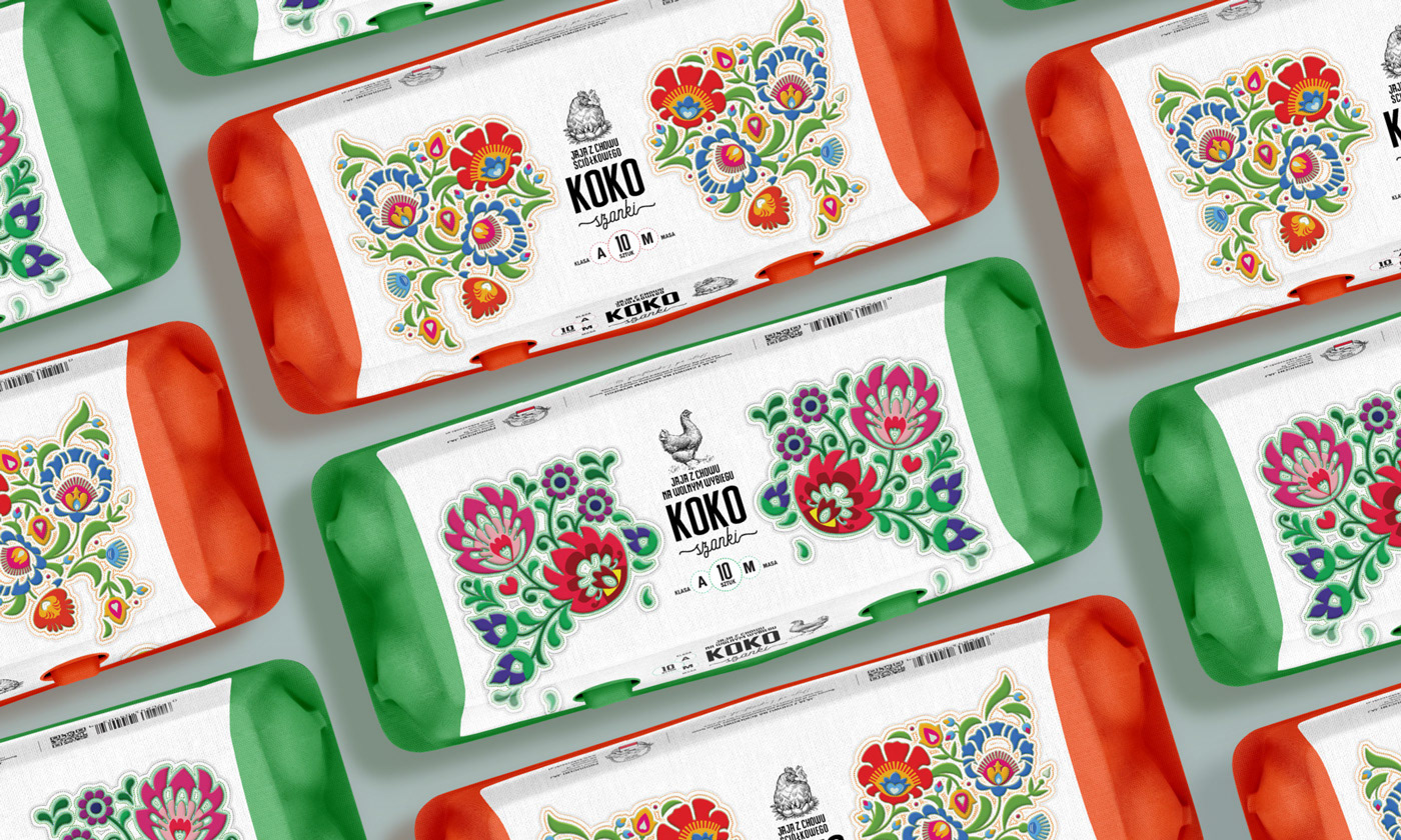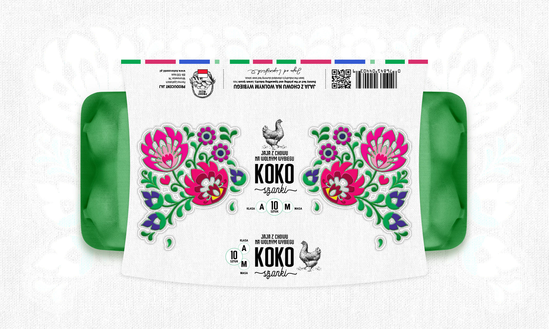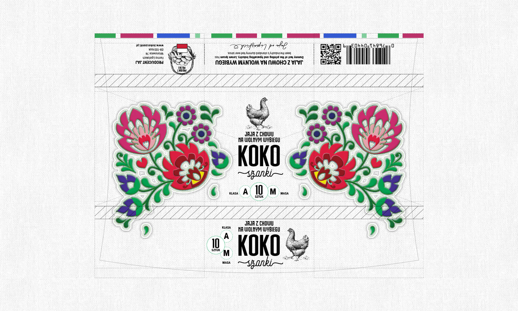 Opakowanie jaj „KokoSzanki” — folkowa ilustracja podkreśla naturalne pochodzenie, tradycję. Białe fronty, akcenty zieleni/czerwieni — wysoka widoczność na półce, świeży, autentyczny odbiór. Komunikat: jaja z chowu na wolnym wybiegu; format dopasowany do potrzeb rynku.