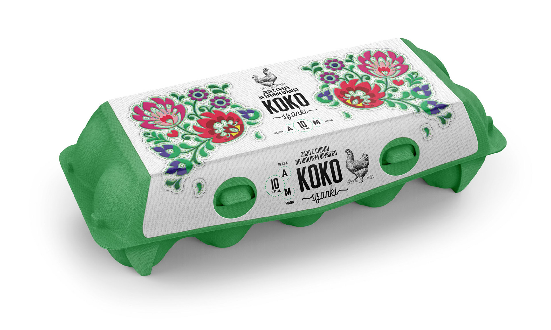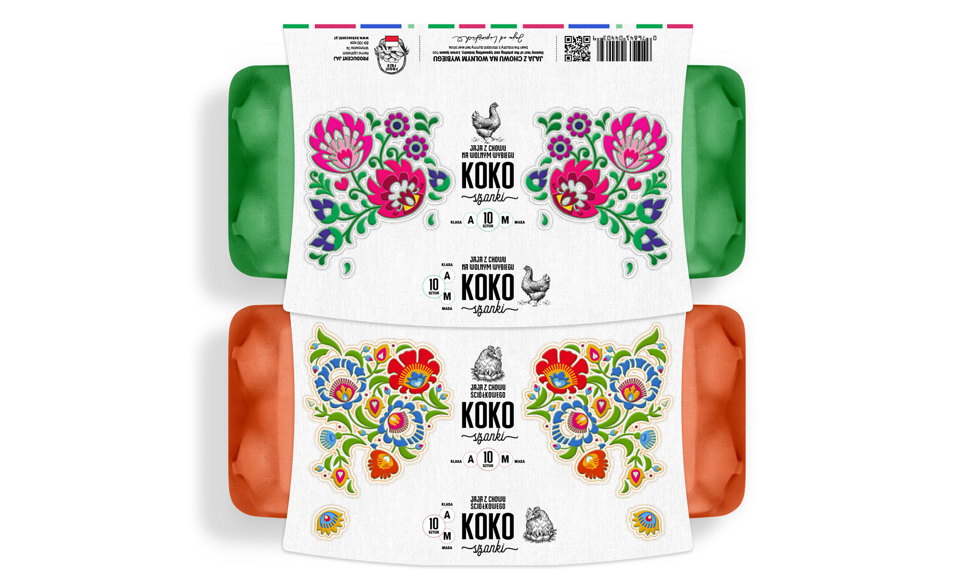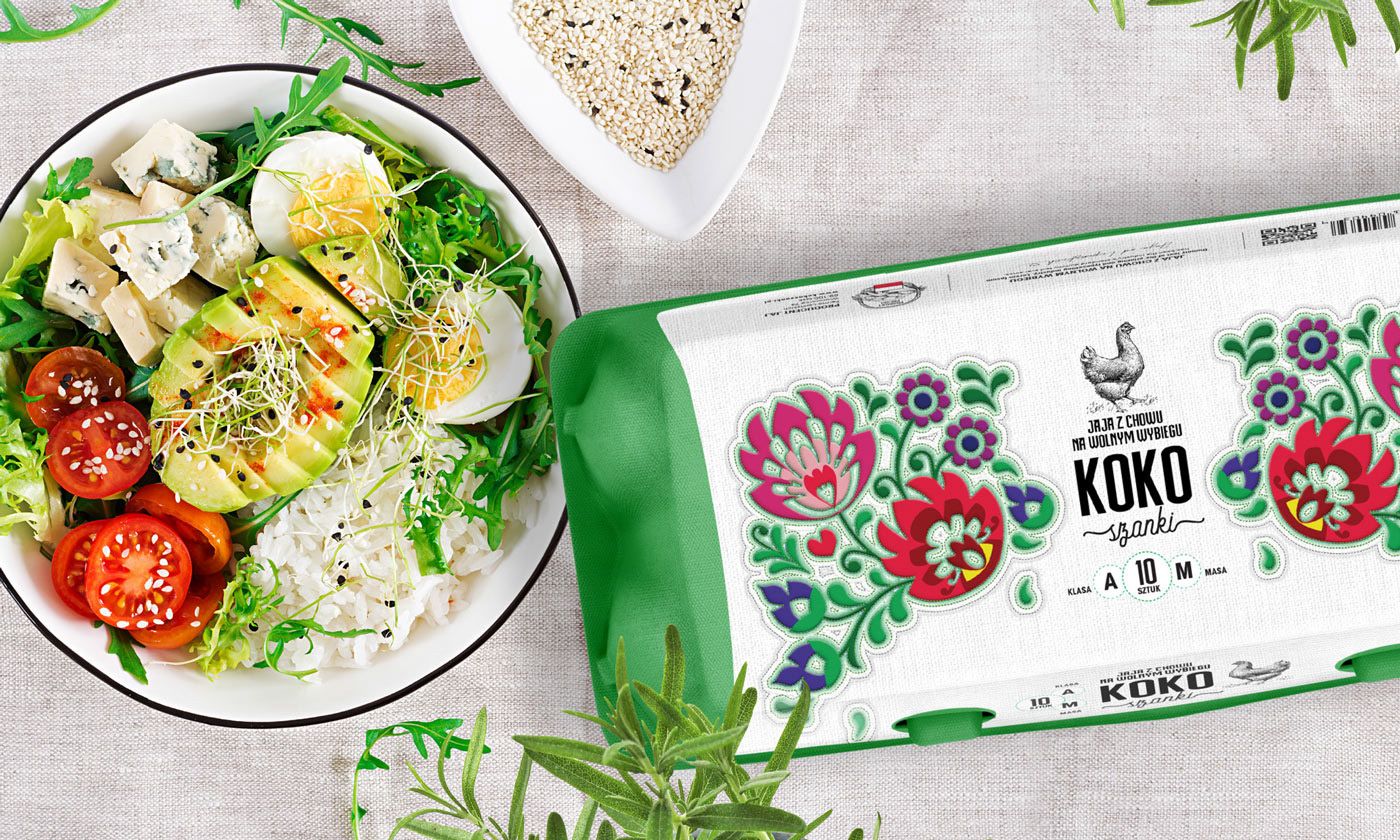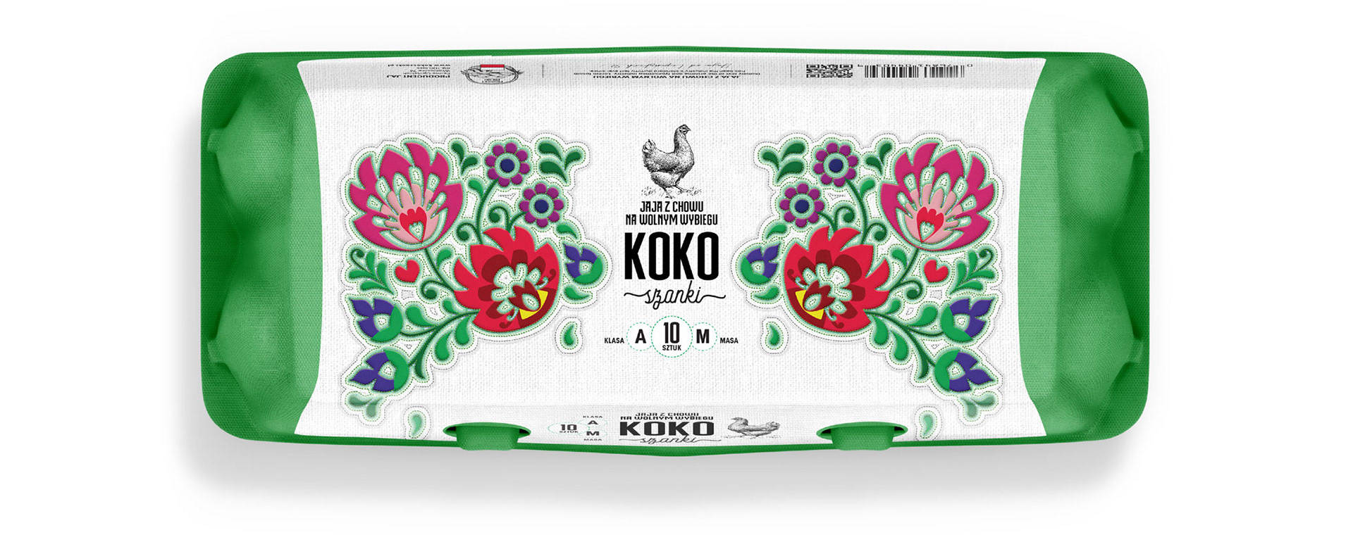 Opakowanie jaj „KokoSzanki” — folkowa ilustracja podkreśla naturalne pochodzenie, tradycję. Białe fronty, akcenty zieleni/czerwieni — wysoka widoczność na półce, świeży, autentyczny odbiór. Komunikat: jaja z chowu na wolnym wybiegu; format dopasowany do potrzeb rynku.
