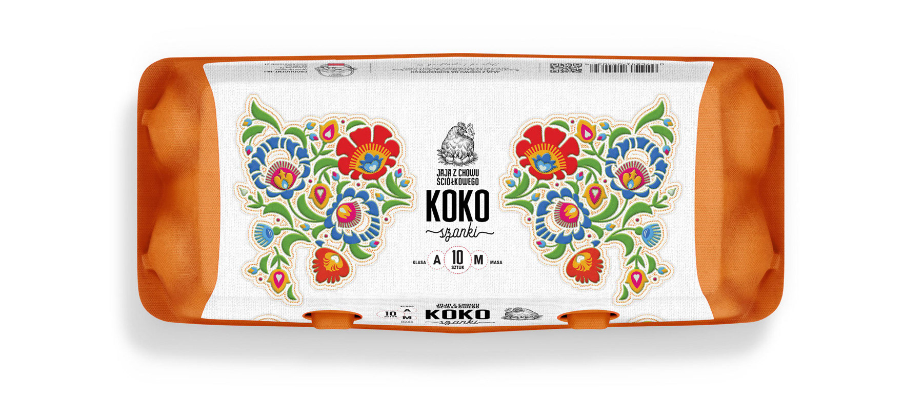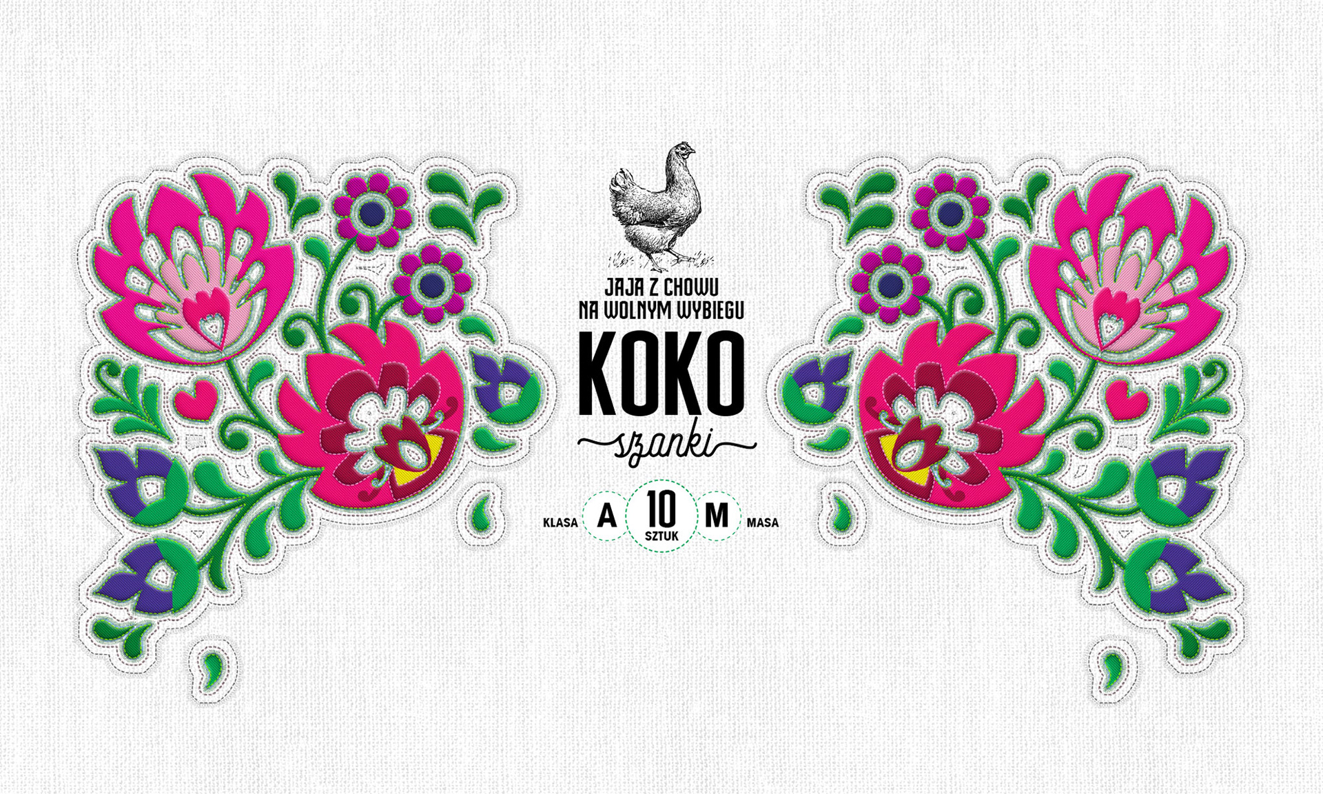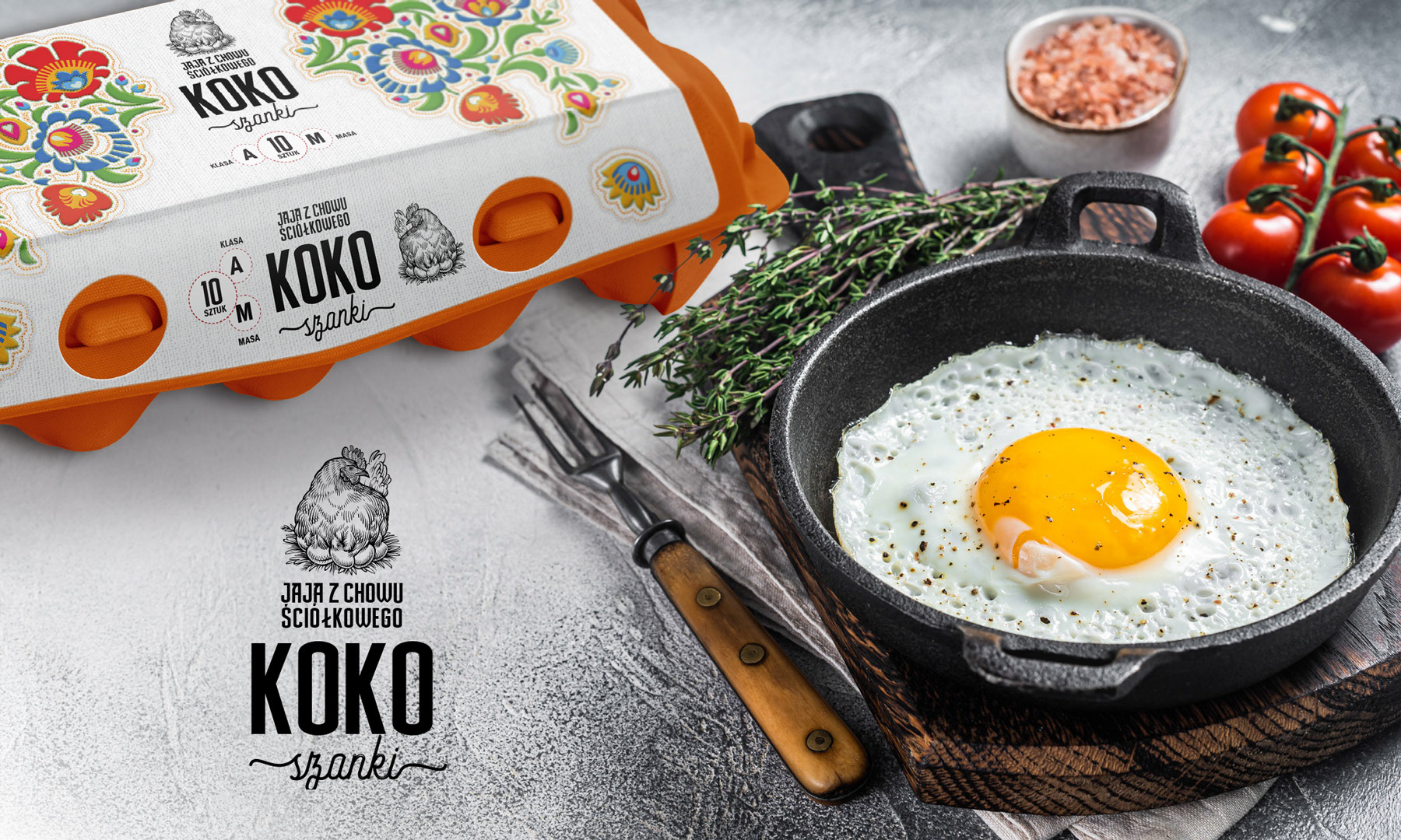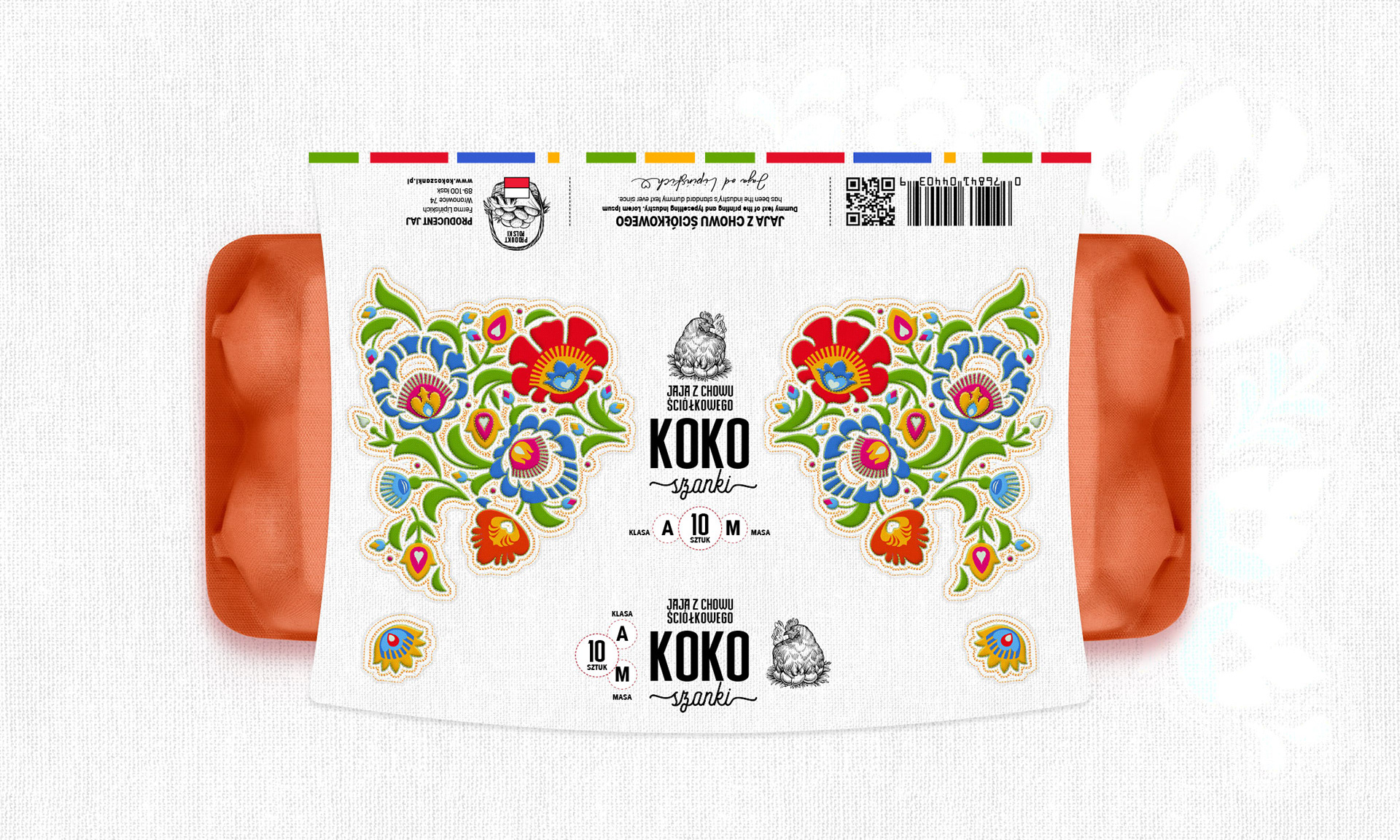 Opakowanie jaj „KokoSzanki” — folkowa ilustracja podkreśla naturalne pochodzenie, tradycję. Białe fronty, akcenty zieleni/czerwieni — wysoka widoczność na półce, świeży, autentyczny odbiór. Komunikat: jaja z chowu na wolnym wybiegu; format dopasowany do potrzeb rynku.
