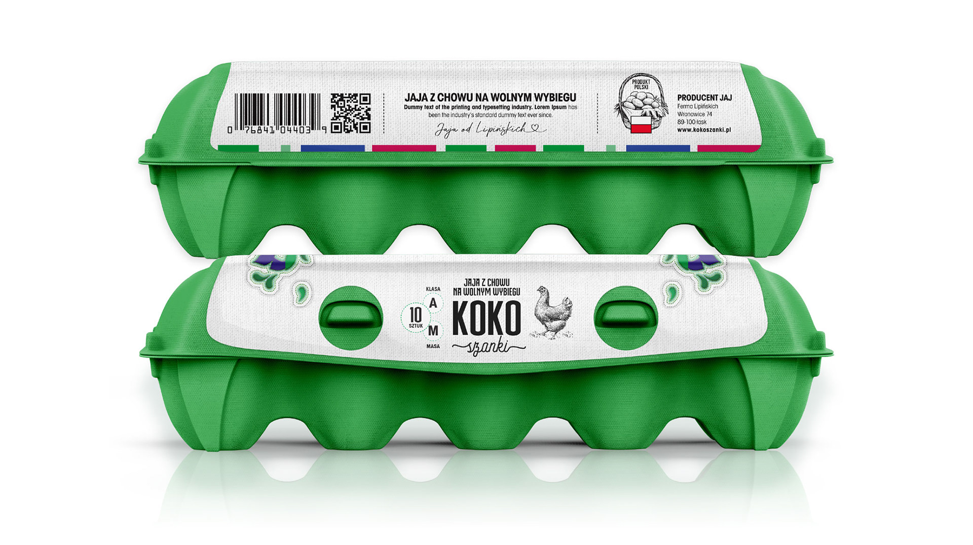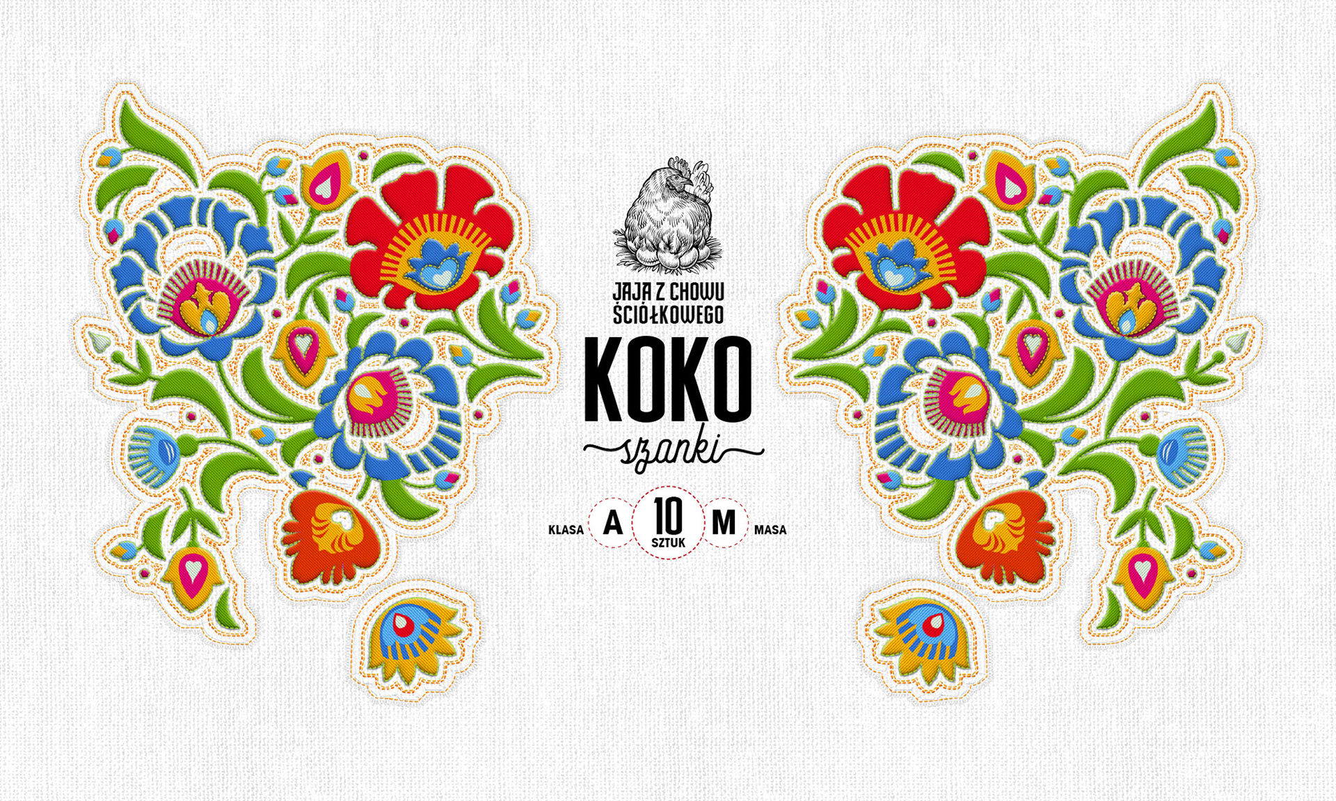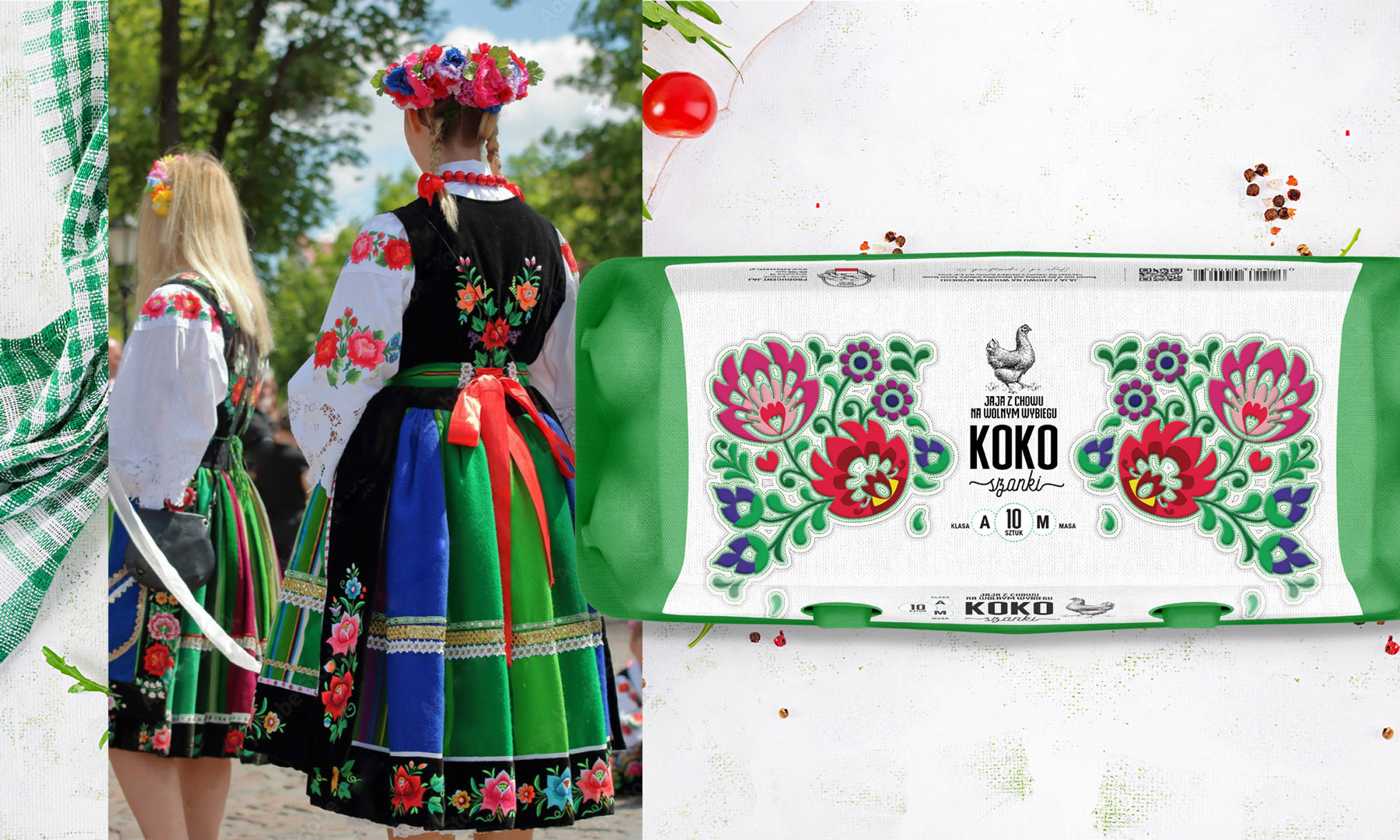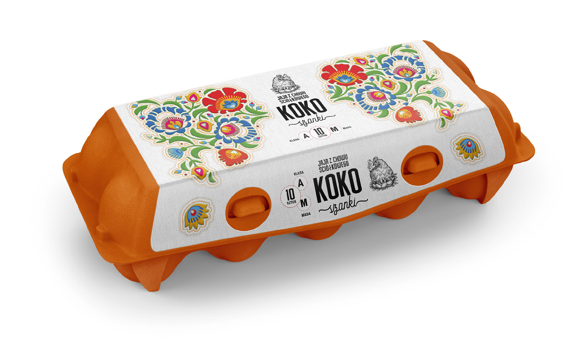 Opakowanie jaj „KokoSzanki” — folkowa ilustracja podkreśla naturalne pochodzenie, tradycję. Białe fronty, akcenty zieleni/czerwieni — wysoka widoczność na półce, świeży, autentyczny odbiór. Komunikat: jaja z chowu na wolnym wybiegu; format dopasowany do potrzeb rynku.