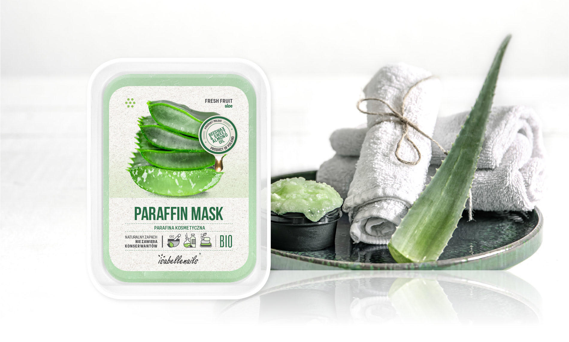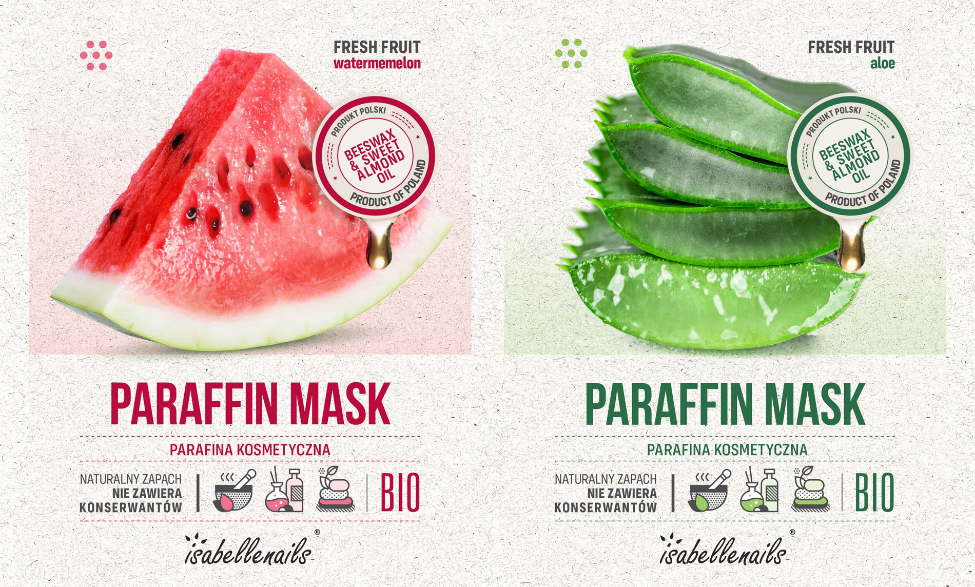 Linia Paraffin Mask w estetyce fresh & clean: biel, pastelowe kodowanie wariantów (aloes/arbuz) oraz duży, soczysty key visual składnika. Medalion “Beeswax & Sweet Almond Oil” z kroplą + piktogramy rytuału spa komunikują naturalny skład, BIO, brak konserwantów. Lekki, modułowy front na tackach zapewnia szybki odczyt w drogerii i łatwe skalowanie linii.