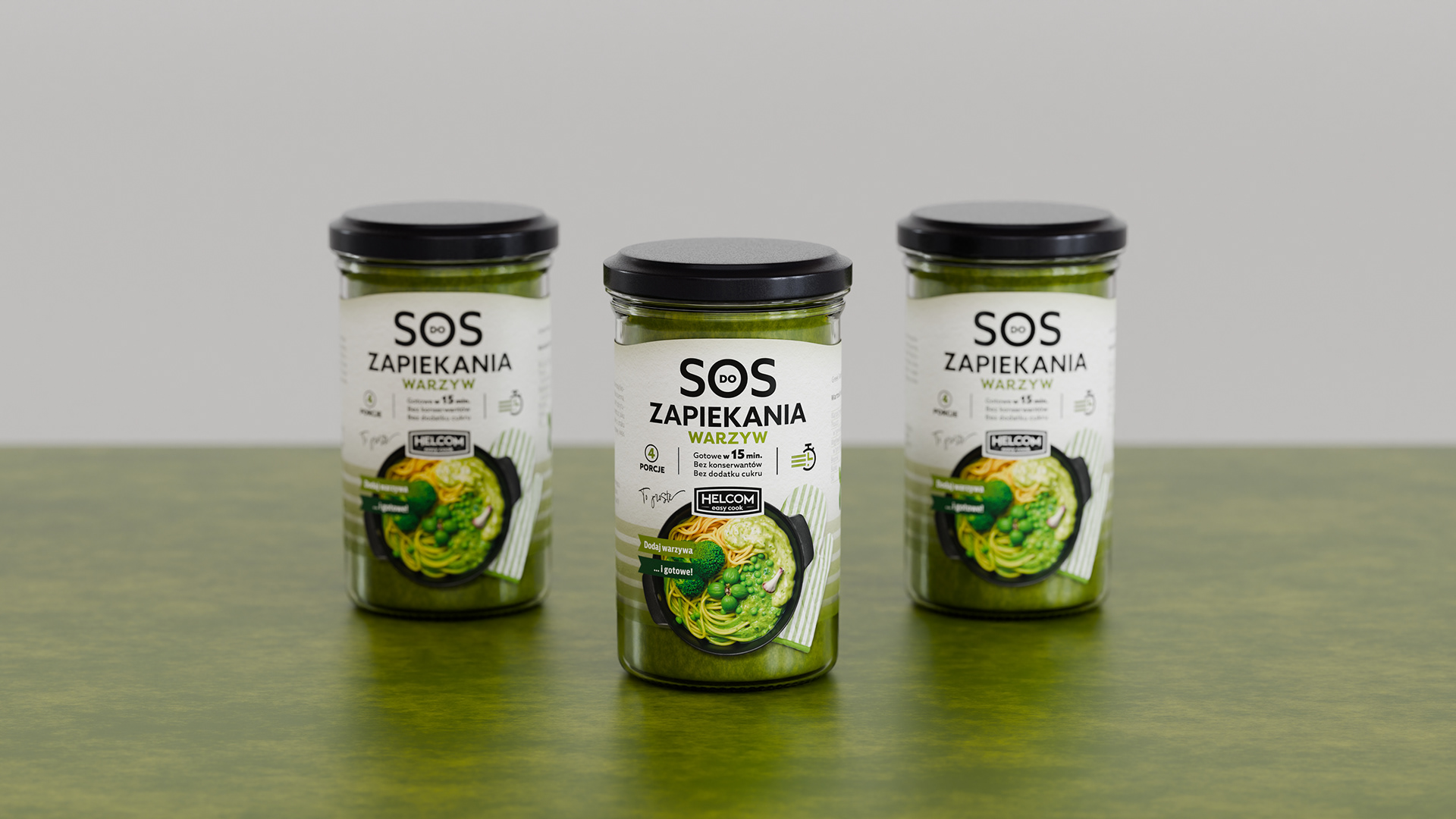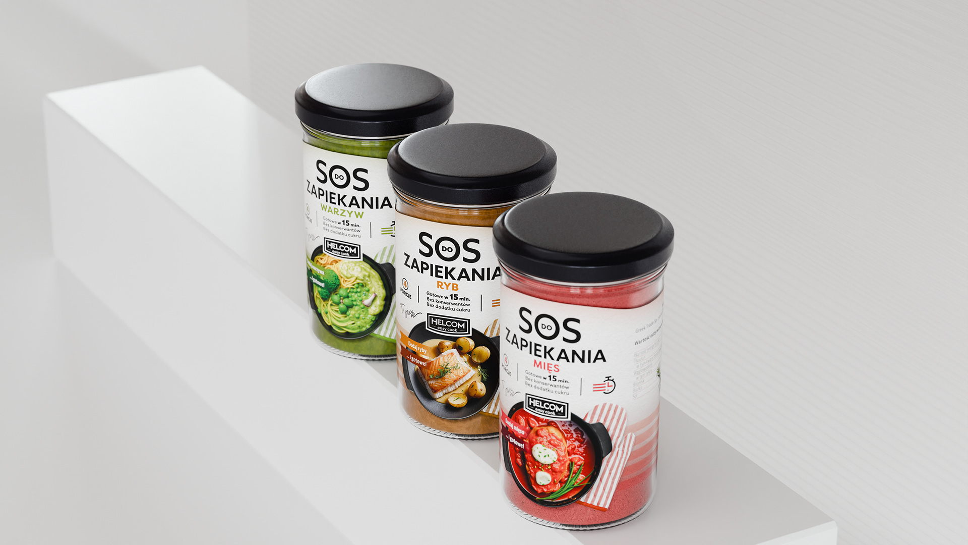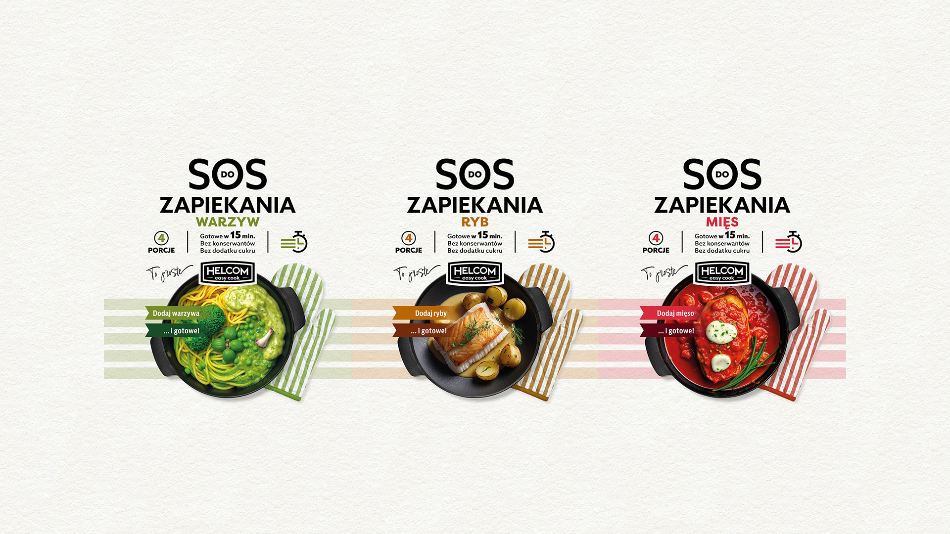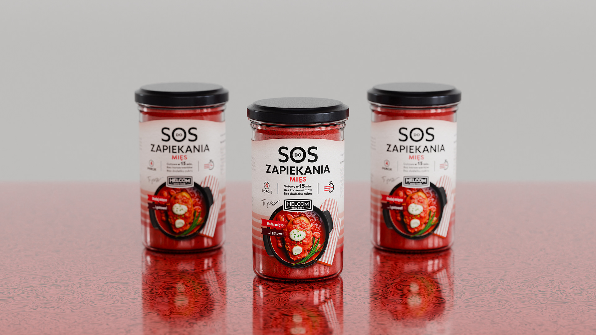 Etykieta linii „Sos do zapiekania” zaprojektowana pod szybki skan na półce: mocna typografia nazwy, klarowne kodowanie kolorami wariantów oraz wyeksponowane korzyści („15 min”, porcje, czysty skład). Layout „kuchenny” z patelnią i wstęgą CTA („Dodaj… i gotowe!”) buduje natychmiastowe zrozumienie zastosowania i skraca drogę do zakupu.