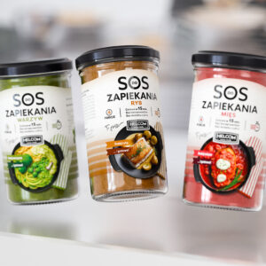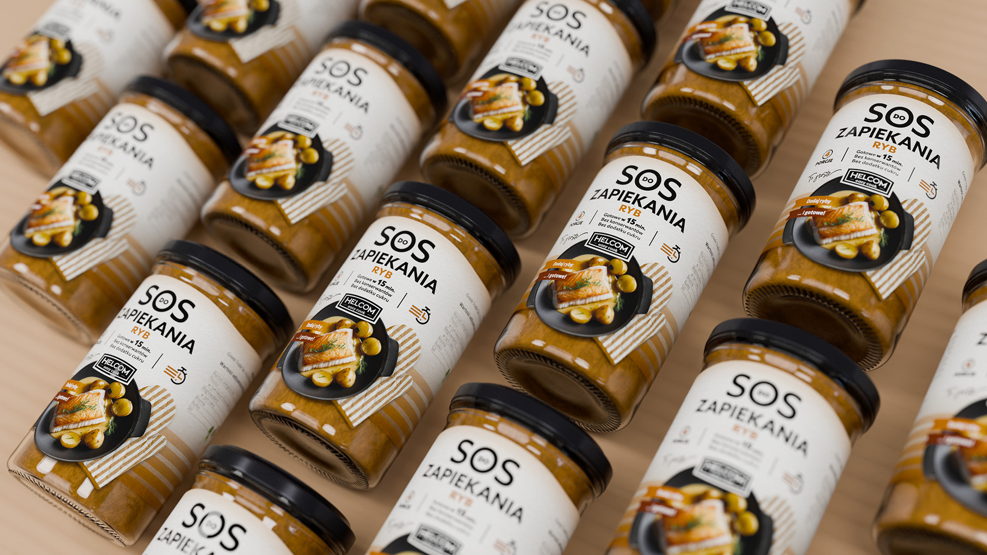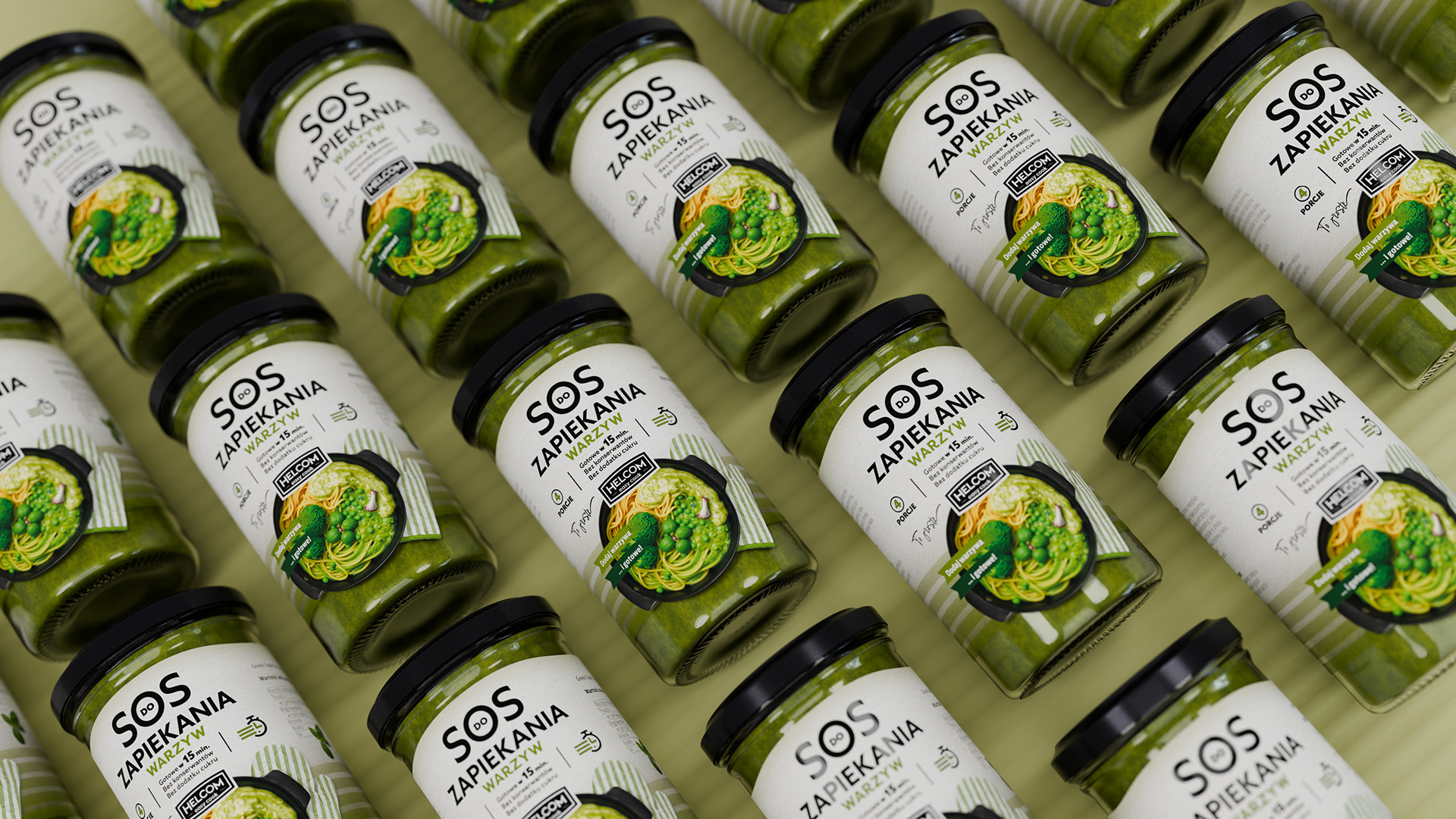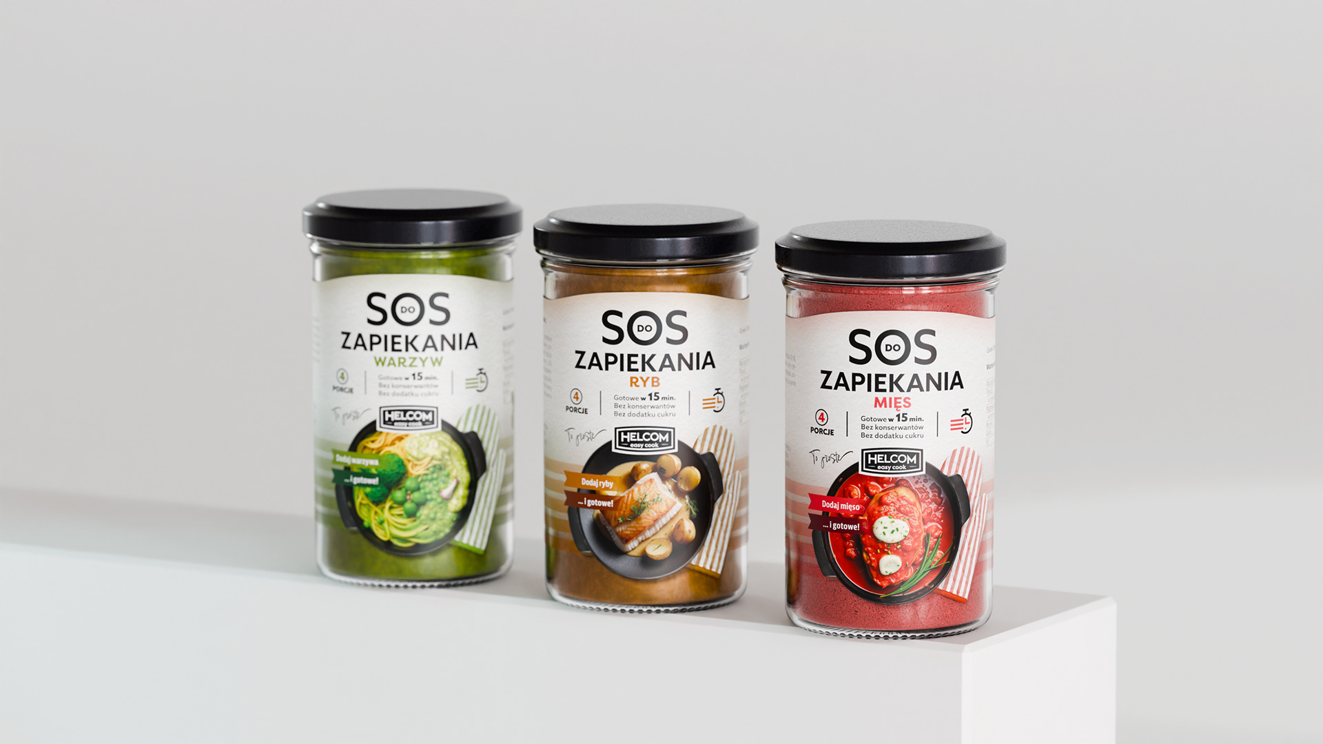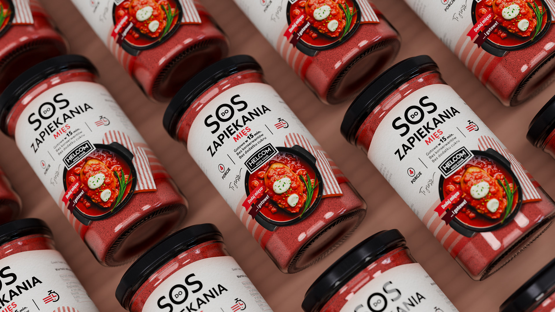 Etykieta linii „Sos do zapiekania” zaprojektowana pod szybki skan na półce: mocna typografia nazwy, klarowne kodowanie kolorami wariantów oraz wyeksponowane korzyści („15 min”, porcje, czysty skład). Layout „kuchenny” z patelnią i wstęgą CTA („Dodaj… i gotowe!”) buduje natychmiastowe zrozumienie zastosowania i skraca drogę do zakupu.