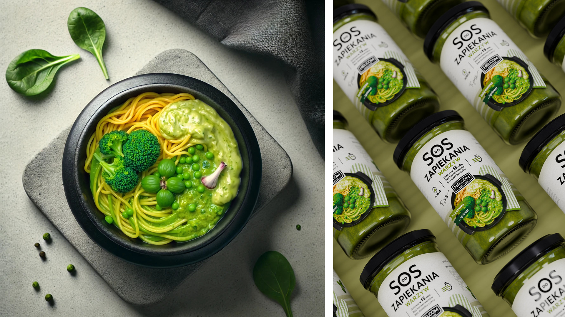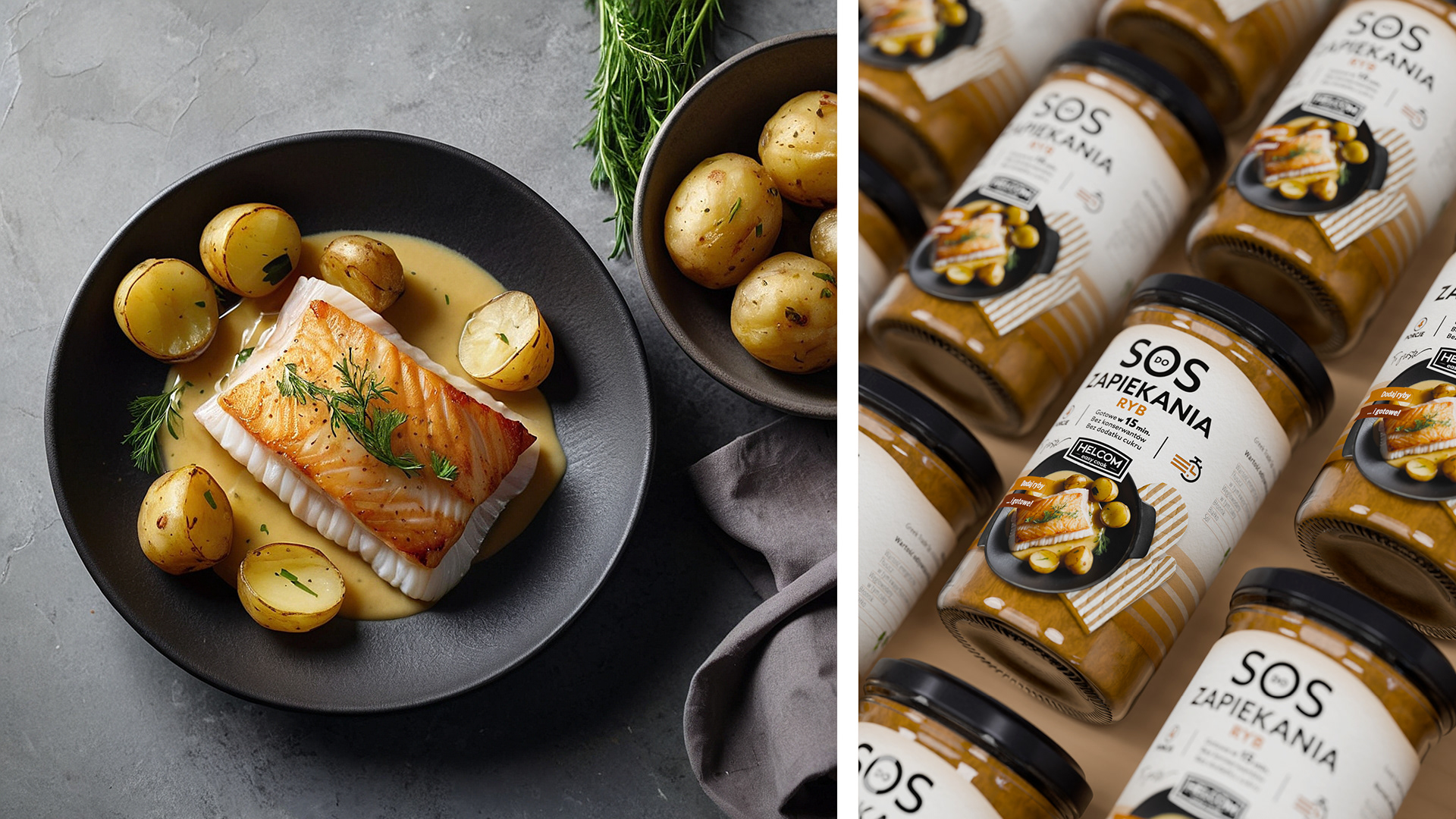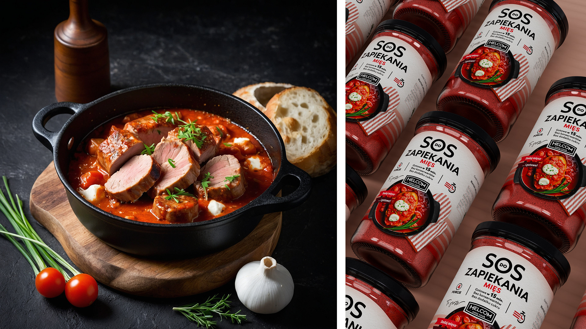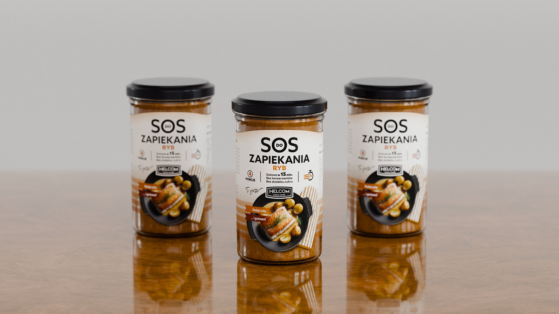 Etykieta linii „Sos do zapiekania” zaprojektowana pod szybki skan na półce: mocna typografia nazwy, klarowne kodowanie kolorami wariantów oraz wyeksponowane korzyści („15 min”, porcje, czysty skład). Layout „kuchenny” z patelnią i wstęgą CTA („Dodaj… i gotowe!”) buduje natychmiastowe zrozumienie zastosowania i skraca drogę do zakupu.