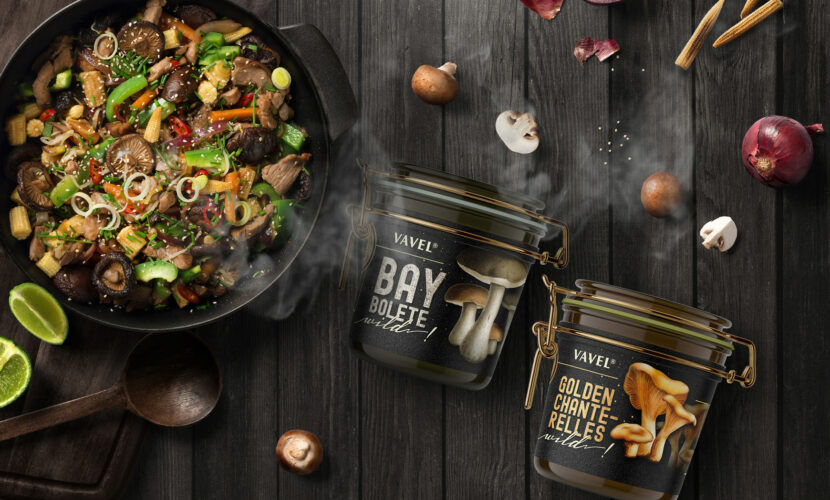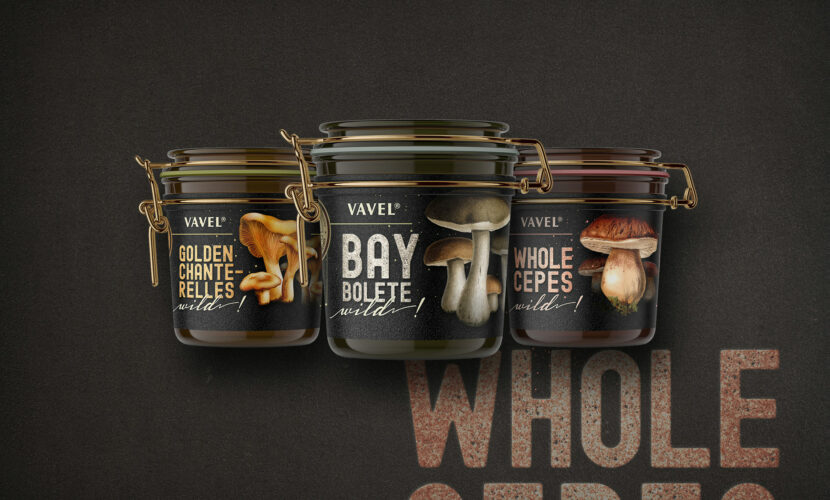 Etykiety linii Vavel – Wild Mushrooms stawiają na głęboką czerń, „ziarniste” liternictwo i magiczne grzyby – od razu czuć leśny, rzemieślniczy charakter. Metalowa klamra w złotym odcieniu oraz znak „wild!” podbijają premium, a klarowne nazwy wariantów (Bay Bolete / Whole Cepes / Golden Chanterelles) gwarantują szybki wybór na półce. Ikonografia (vegan, GMO-free, Product of Poland) porządkuje decyzję zakupową na rynkach eksportowych.