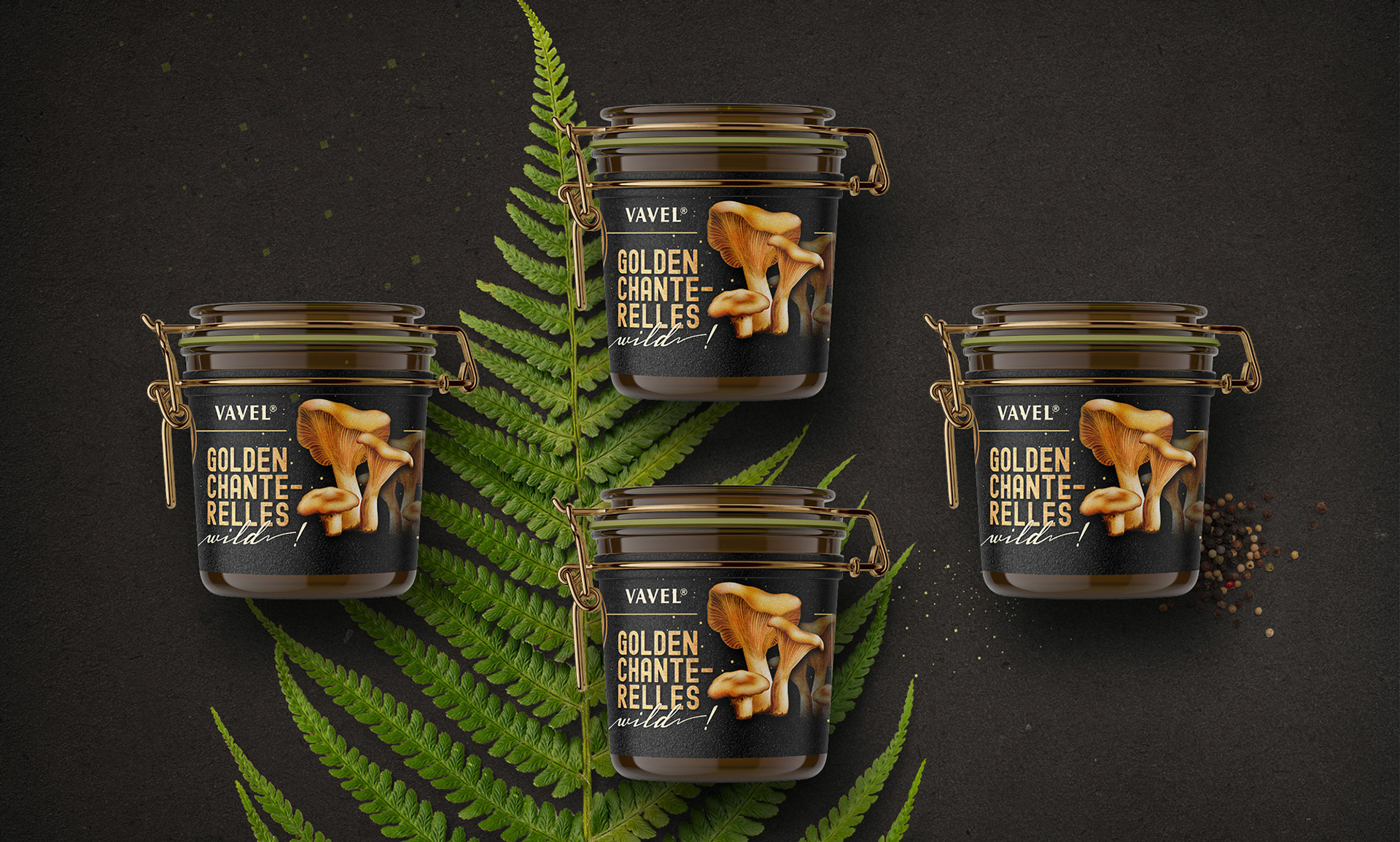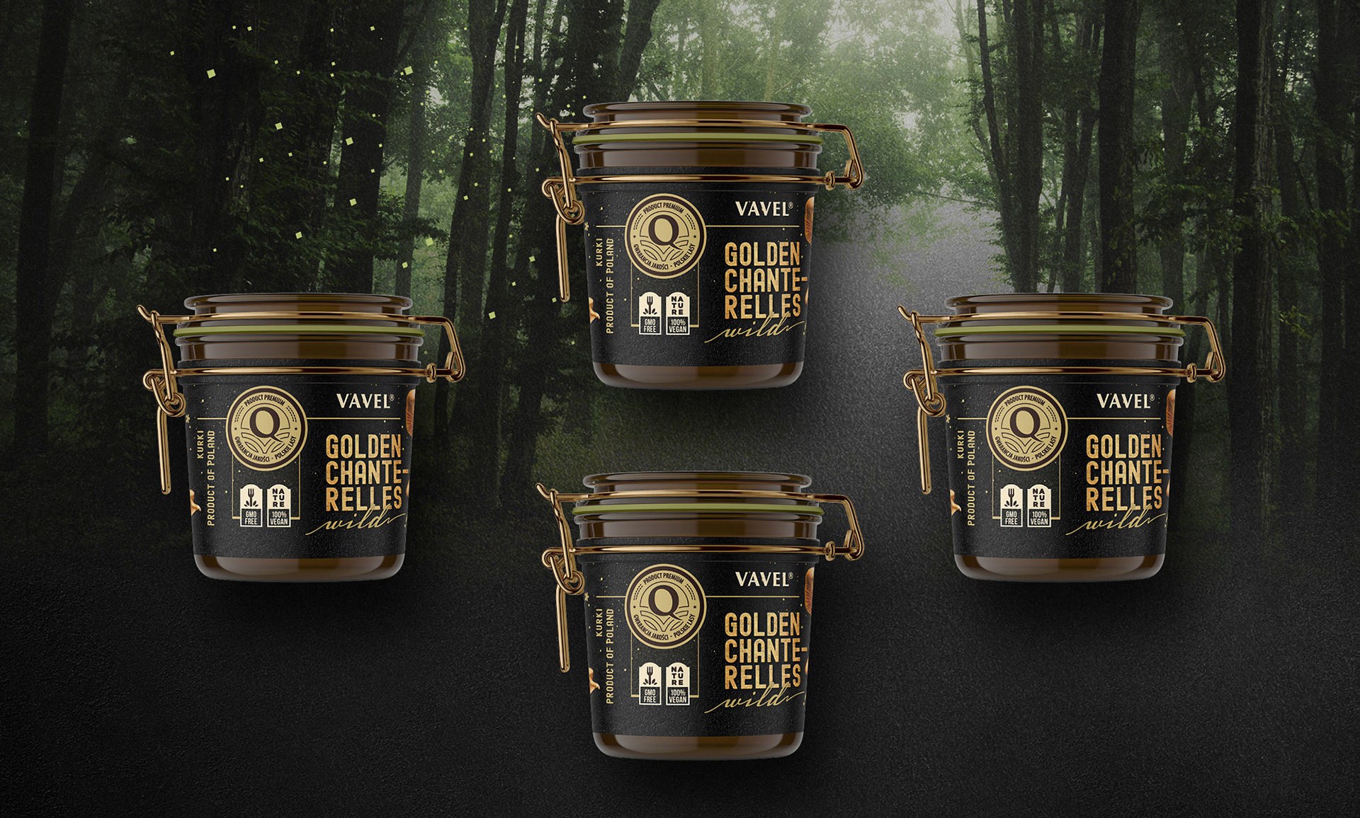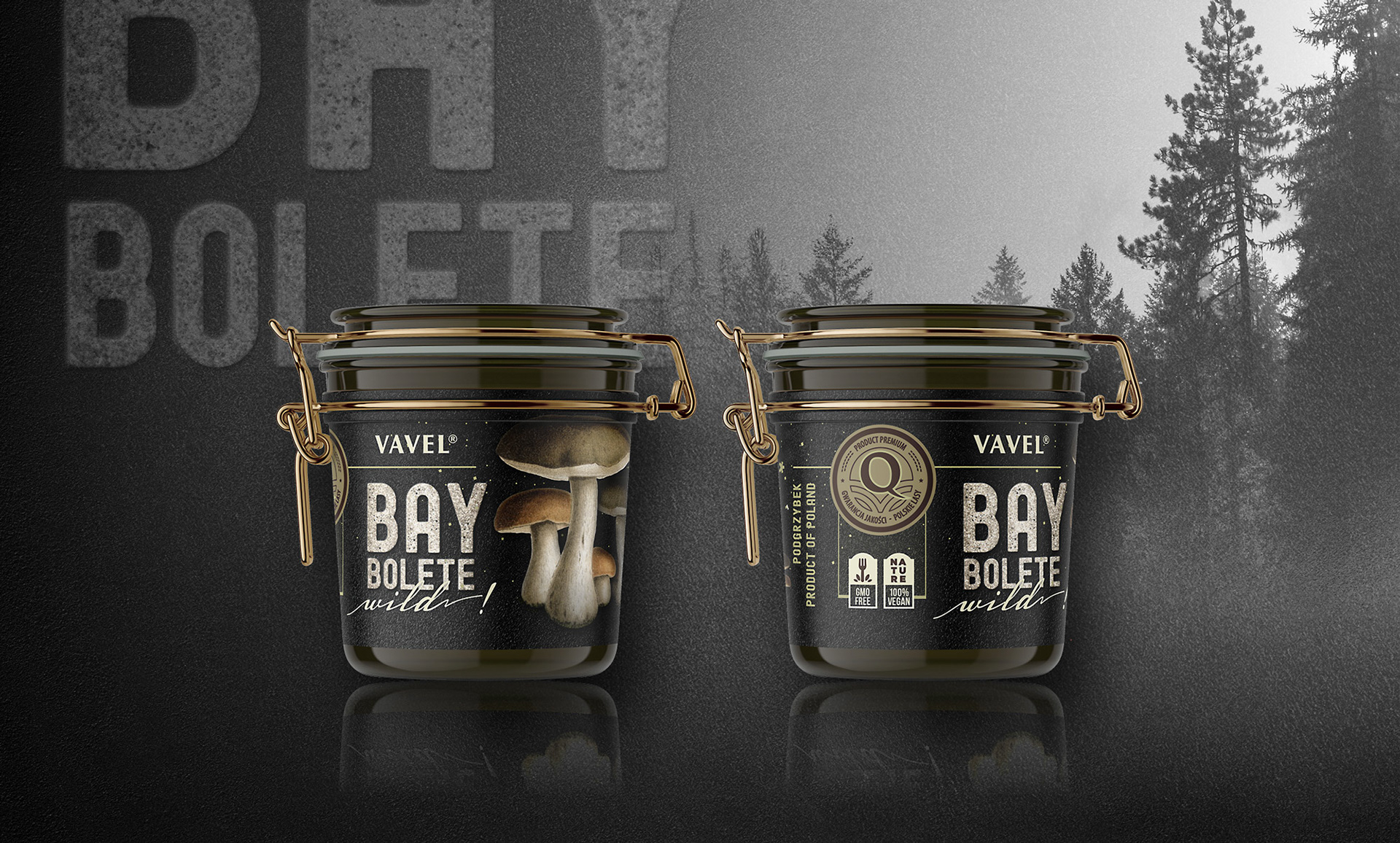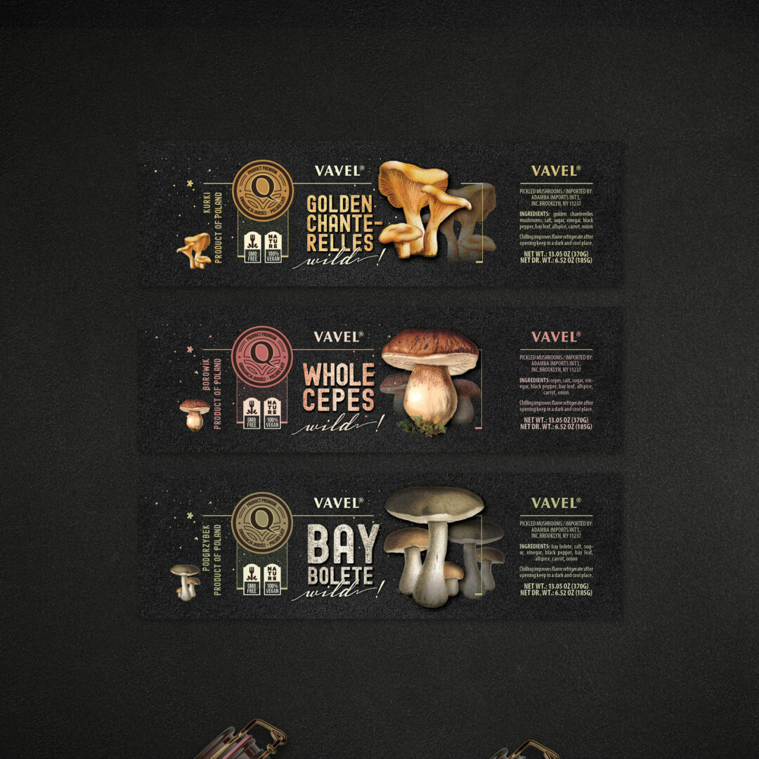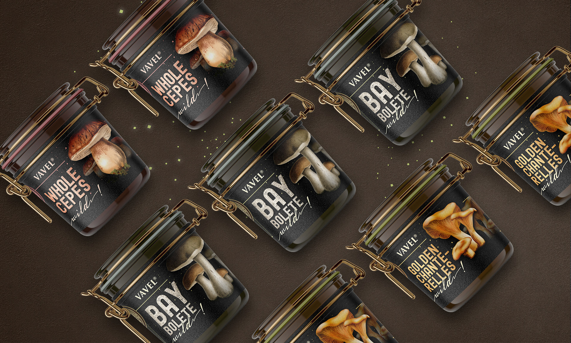 Etykiety linii Vavel – Wild Mushrooms stawiają na głęboką czerń, „ziarniste” liternictwo i magiczne grzyby – od razu czuć leśny, rzemieślniczy charakter. Metalowa klamra w złotym odcieniu oraz znak „wild!” podbijają premium, a klarowne nazwy wariantów (Bay Bolete / Whole Cepes / Golden Chanterelles) gwarantują szybki wybór na półce. Ikonografia (vegan, GMO-free, Product of Poland) porządkuje decyzję zakupową na rynkach eksportowych.